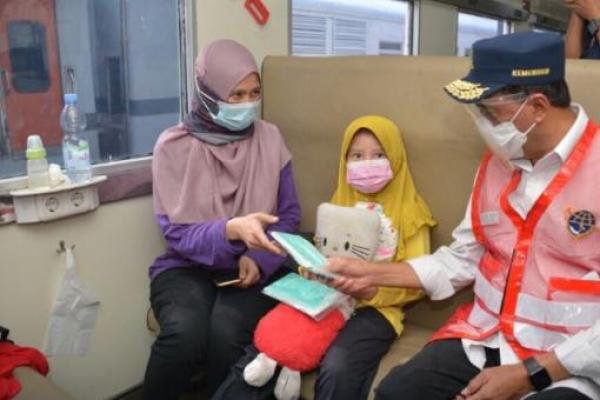 Menteri Perhubungan (Menhub), Budi Karya Sumadi membagikan masker kepada penumpang kereta api. (Foto: Ist)