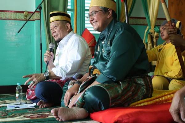 Ketua DPD RI (kiri) didampingi YAM Raja Mempawah XIII Pangeran Ratu Mulawangsa Mardan Adijaya Kesuma Ibrahim, Karaeng To Manuru Patileka Patikenag I Lagaligo saat memberikan sambutan saat melakukan kunjungan kerja ke Kerajaan Mempawah, Sabtu (30/10). (Foto: Humas DPD RI)