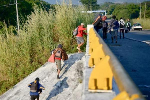 Para migran berjalan di atas jalan layang dalam karavan menuju perbatasan utara, di Tapanatepec, Meksiko pada 9 November 2021. (Foto: REUTERS/Jacob Garcia)
