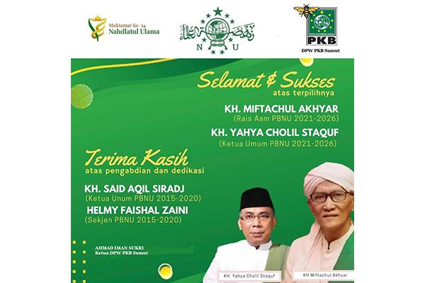 "Kami segenap pengurus wilayah Partai Kebangkitan Bangsa mengucapkan selamat kepada KH. Miftahul Ahyar dan KH. Yahya Cholil Staquf atas terpilihnya sebagai Rois Am dan Ketua Umum PBNU masa khidmad 2021 - 2026, pada Muktama NU ke-34 di Bandar Lampung", Ungkap Ahmad Iman, saat jurnas.news meminta tanggapannya, di Bandar Lampung, Jumat (24/12).