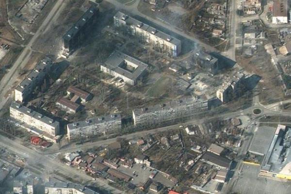 Tampilan satelit gedung apartemen dan toko yang terbakar dan rusak berat di Mariupol pada 18 Maret 2022. (Citra satelit Handout: 2022 Maxar Technologies via Reuters)