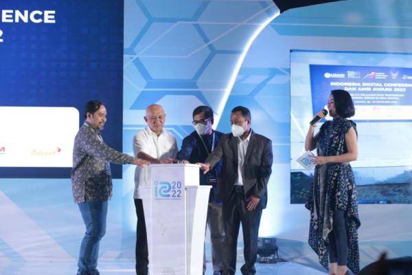 Menteri Koperasi da UKM Teten Masduki (baju putih) bersama Ketua AMSI Wenseslaus Manggut (dua dari kanan) membuka secara resmi gelaran Indonesia Digital Conference (IDC) 2022 di Jakarta, Selasa (22/11/2022). Foto: amsi/jurnas