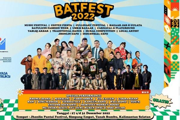 Sementara para artis yang bakal memeriahkan panggung Batfest 2022 di antaranya Sanggar Bawi Lamus, Sangpeng Borneo Ethnica, Ska Men Rider dan Tipe-X (27/12/2022), Goodfather, Revife dan Endank Soekamti (28/12/2022), Ba’sape, SansProject dan Primitive Monkey Noose (29/12/2022), Cakra Khan, RAN, Kangen Band dan Soneta (30/12/2022), serta malam pergantian tahun yang bakal dimeriahkan Vierratale, Mahalini, Wali, Nassarserta Via Vallen.