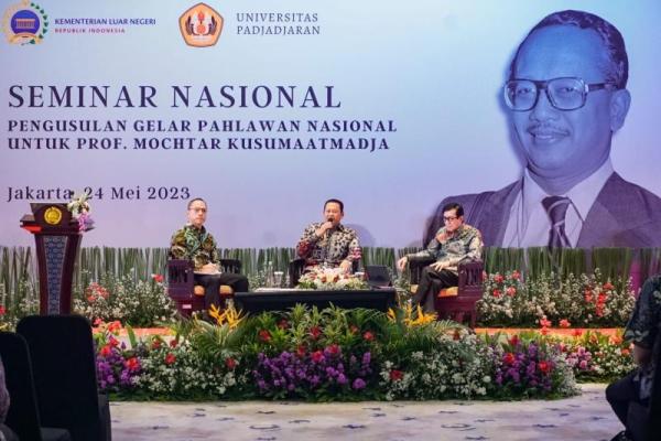 Ketua MPR, Bambang Soesatyo dalam Seminar Nasional Pengusulan Gelar Pahlawan Nasional untuk Prof. Mochtar Kusumaatmadja, di Kantor Kementerian Luar Negeri RI, Jakarta, Rabu (24/5/23). (Foto: Humas MPR)