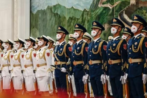 Pengawal Kehormatan Tiongkok mengambil formasi di Aula Besar Rakyat di Beijing pada 28 Juni 2023 (Foto: Pool/AFP/Jade Gao)