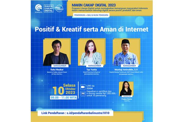 ”Ada beberapa kiat agar kita cakap bermedia digital,” tutur presenter TV Tya Yustia, dalam webinar literasi digital yang digelar Kementerian Komunikasi dan Informatika (Kemenkominfo) bekerja sama dengan Kantor Dinas Pendidikan dan Kebudayaan Provinsi Nusa Tenggara Barat (NTB) untuk komunitas pendidikan di wilayah Bali-Nusa Tenggara, Selasa (10/10).
