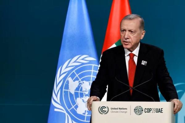 Presiden Turki Tayyip Erdogan menyampaikan pernyataan nasional pada KTT Aksi Iklim Dunia di Dubai, Uni Emirat Arab, 1 Desember 2023. Foto: Reuters