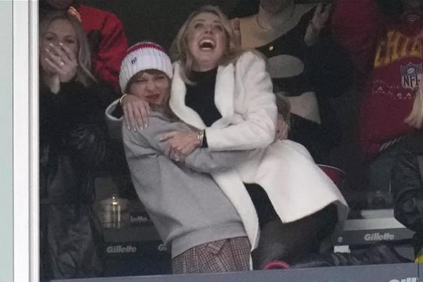 Para fotografer mengabadikan momen menggembirakan itu. Brittany Mahomes (28) tersenyum bahagia sambil memeluk Taylor Swift.