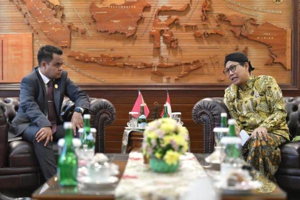 Sekretaris Negara Pembangunan Lokal Timor Leste Mateus Wilfredus dos Santos Tallo saat audiensi dengan Gus Halim di Kantor Kemendes PDTT Jakarta, Selasa (23/1/2024). (Foto: Humas Kemendes PDTT)