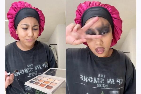 North West kemudian mengoleskan eyeshadow hitam ke kelopak matanya untuk memberikan pandangan lain pada warnanya.
