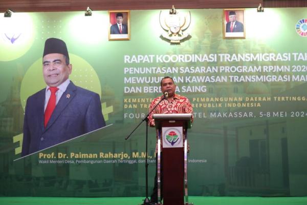 Wakil Menteri Desa, Pembangunan Daerah Tertinggal, dan Transmigrasi (Wamendes PDTT) Paiman Raharjo memberi arahan sekaligus menutup kegiatan Rapat Koordinasi (Rakor) Transmigrasi Tahun 2024, di Ballroom Fourpoints Hotel, Kota Makassar, Provinsi Sulawesi Selatan, Selasa (7/5/2024). (Foto: Kemendes PDTT)