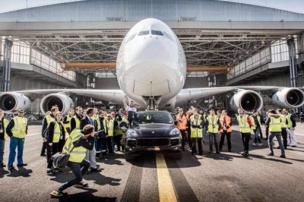 detik-detik saat mobil Cayenne S Diesel menarik pesawat terbesar di dunia