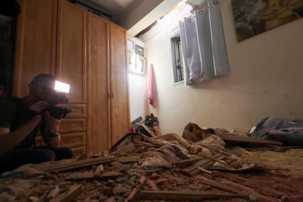 Seorang awak media bekerja di sebuah ruangan yang rusak setelah roket ditembakkan dari Jalur Gaza ke arah Israel, di Herzliya, Israel 26 Mei 2024. REUTERS