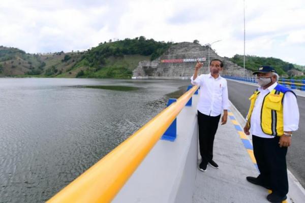 Presiden Jokowi dan Menteri PUPR Basuki Hadimuljono di bendungan Karalloe, Gowa, Sulsel