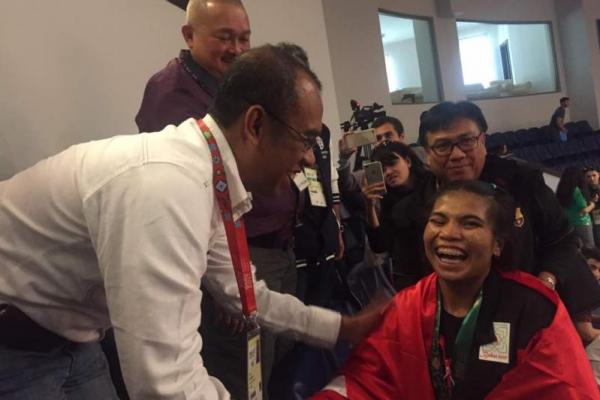Sesmenpora Gatot S Dewa Broto menyampaikan selamat kepada peraih Emas ISG 2017, Sri Wahyuni.