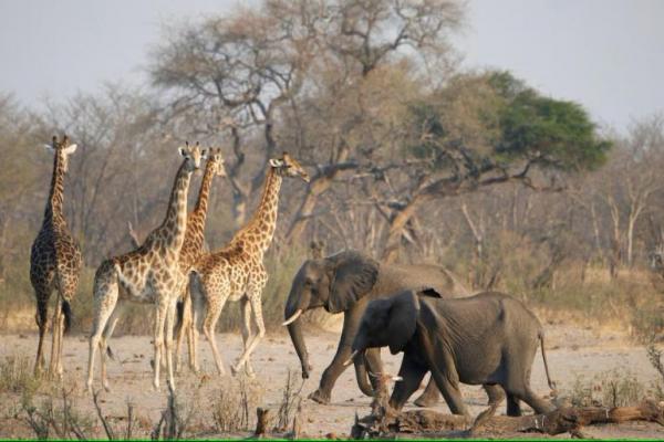 Sekelompok gajah dan jerapah berjalan di dekat lubang air di dalam Taman Nasional Hwange, di Zimbabwe, 23 Oktober 2019. REUTERS