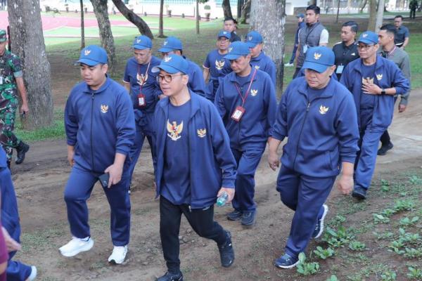Mendes Yandri bersama sejumlah kolega seperti Menteri Investasi Rosan Roeslani, Penasehat Khusus Dudung Abdurachman, dan Menko PMK Pratikno berjalan melewati lokasi Retreat ke Bukit Tidar.