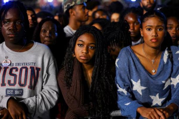 Peserta bereaksi terhadap hasil pemilu awal pada kampanye calon presiden dari Partai Demokrat AS Kamala Harris, di Universitas Howard, di Washington, AS, 5 November 2024 REUTERS