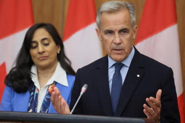 Perdana Menteri Kanada Mark Carney berbicara pada konferensi pers tentang pengakuan negara Palestina sementara Menteri Luar Negeri Anita Anand mendengarkan, di Ottawa, Ontario, Kanada, 30 Juli 2025. REUTERS