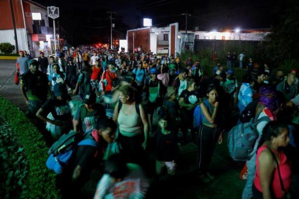Para migran berjalan dalam karavan menuju perbatasan AS, di Huixtla, Meksiko, 7 November 2024. REUTERS