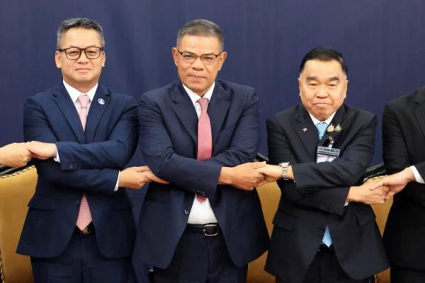 Wakil Menhan Thailand Nattaphon Narkphanit, Mendagri Malaysia Saifuddin Nasution Ismail, dan Menhan Kamboja Jenderal Tea Seiha foto bersama menjelang Komite Perbatasan Umum Luar Biasa di Kuala Lumpur, Malaysia, 7 Agustus 2025. REUTERS