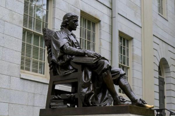 Patung John Harvard di kampus Universitas Harvard di Cambridge, Massachusetts, AS, 23 Mei 2025. REUTERS