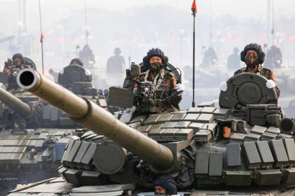 Personel militer di dalam tank berpartisipasi dalam parade pada Hari Angkatan Bersenjata di Naypyitaw, Myanmar, 27 Maret 2021. REUTERS