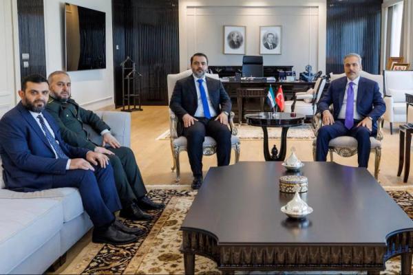 Menlu Suriah Asaad Hassan al-Shibani, didampingi pejabat lainnya bertemu dengan mitranya dari Turki, Hakan Fidan, di Ankara, Turki, 13 Agustus 2025. Handout via REUTERS