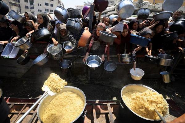 Warga Palestina menunggu untuk menerima makanan dari dapur amal, di Kota Gaza, 15 Agustus 2025. REUTERS
