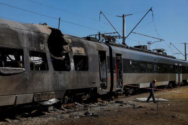 Seorang masinis berjalan di samping kereta HRCS2 Hyundai Rotem milik Kereta Api Ukraina yang terkena serangan pesawat nirawak Rusia, di Kyiv, Ukraina, 28 Agustus 2025. REUTERS