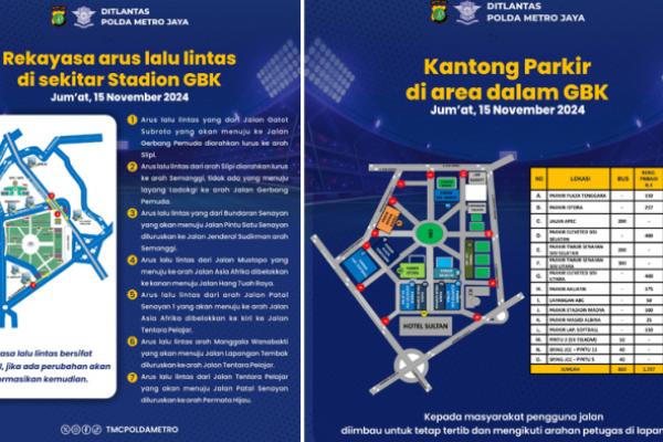 Berikut rekayasa lalu lintas di sekitar GBK sebagaimana dikutip dari akun Instagram TMC Polda Metro Jaya: