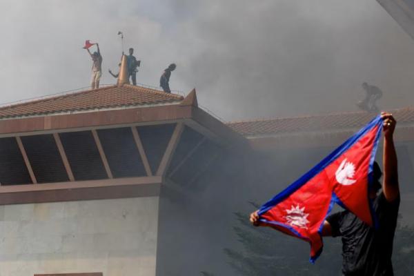 Demonstran mengibarkan bendera saat asap mengepul di kompleks Parlemen, di Kathmandu, Nepal, 9 September 2025. REUTERS