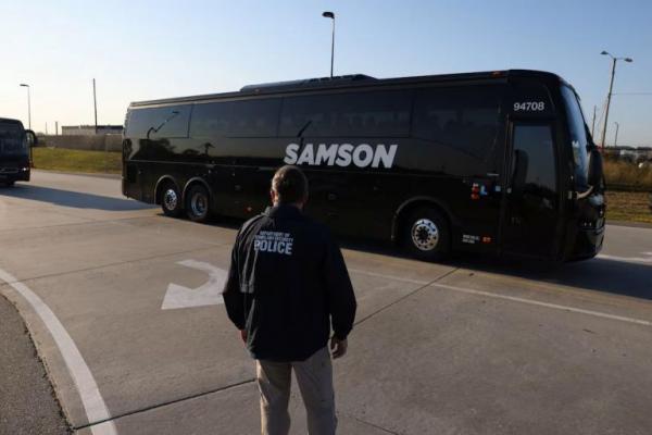 Seorang petugas polisi Departemen Keamanan Dalam Negeri mengarahkan bus-bus yang mengangkut pekerja yang ditahan, di Atlanta, Georgia, AS, 11 September 2025. REUTERS