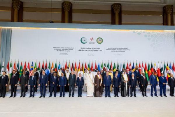 Para peserta KTT darurat para pemimpin Arab-Islam untuk membahas serangan Israel terhadap Hamas di wilayah Qatar, berpose untuk foto keluarga, di Doha, Qatar, 15 September 2025. Qatar News Agency via REUTERS