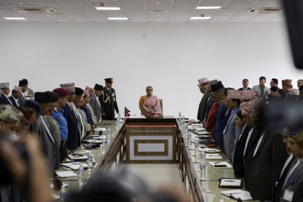 Perdana Menteri sementara Nepal yang baru dilantik, Sushila Karki, mengheningkan cipta untuk mengenang para korban tewas dalam protes, di Kathmandu, Nepal, 14 September 2025. REUTERS