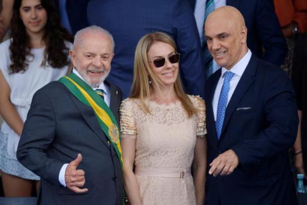 Presiden Brasil Luiz Inacio Lula da Silva berpose untuk berfoto bersama Hakim Mahkamah Agung Brasil Alexandre de Moraes dan istrinya Viviane Barci de Moraes selama parade Hari Kemerdekaan di Brasilia, Brasil, 7 September 2024. REUTERS