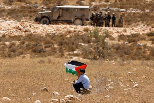 Seorang anak laki-laki memegang bendera Palestina selama demonstrasi menentang penyitaan tanah mereka oleh Israel, di Raba, dekat Jenin, di Tepi Barat yang diduduki Israel, 18 Juli 2025. REUTERS