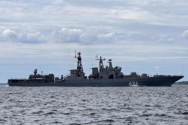 Kapal Angkatan Laut Rusia yang juga sebuah kapal perusak kelas Udaloy I, berlayar melalui Selat Sabuk Besar, Denmark, 31 Agustus 2025. REUTERS