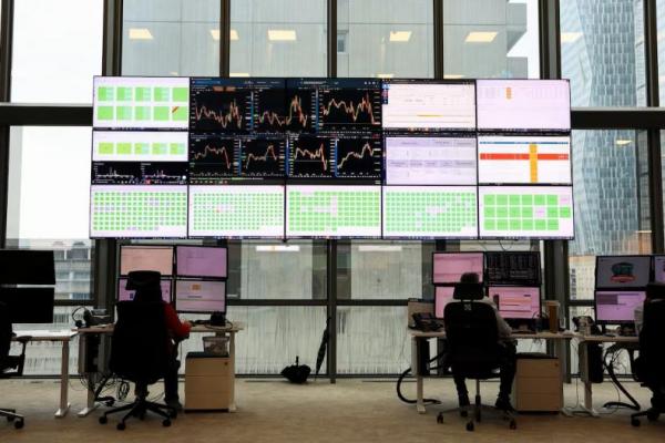 Orang-orang bekerja di lantai perdagangan bursa saham Euronext di kawasan bisnis La Défense, Paris, Prancis, 10 Maret 2025. REUTERS