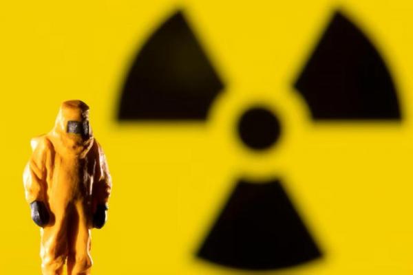 Sebuah patung kecil mengenakan peralatan pelindung terlihat di depan tanda Radiasi yang dipajang dalam ilustrasi ini, diambil pada 9 Maret 2022. REUTERS