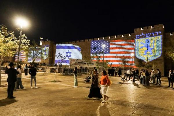 Bendera Amerika Serikat dan Israel diproyeksikan di dinding Kota Tua Yerusalem dalam perayaan setelah Israel dan Hamas menyetujui tahap pertama rencana Presiden AS Donald Trump untuk mengakhiri perang di Gaza, 9 Oktober 2025. REUTERS