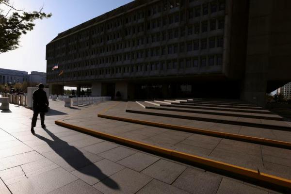 Seorang pria membentuk bayangan saat berjalan menuju Gedung Hubert H. Humphrey, kantor pusat Departemen Kesehatan dan Layanan Kemanusiaan, di Washington, AS, 1 April 2025. REUTERS