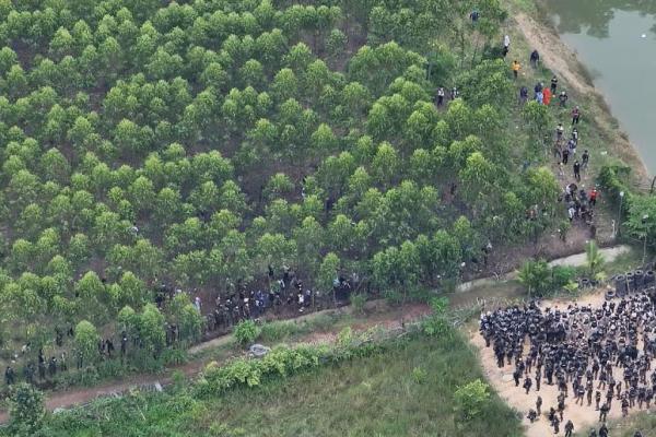 Tampilan drone menunjukkan tentara Thailand dan petugas polisi anti huru hara berhadapan dengan warga Kamboja di sebuah desa yang disengketakan di sepanjang perbatasan Thailand-Kamboja di Provinsi Sa Kaeo, Thailand, 17 September 2025. REUTERS