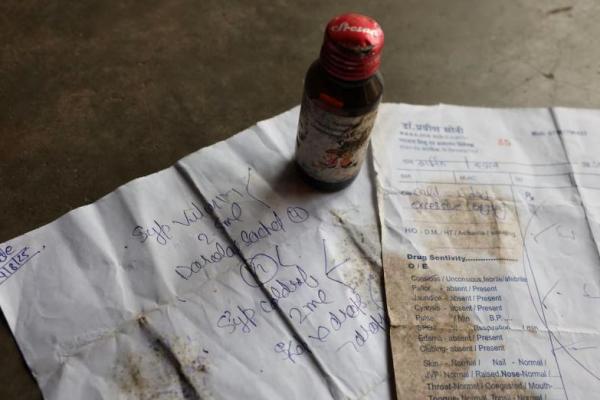 Sebotol sirup obat batuk Coldrif dan resep yang diterima Reema Yaduvanshi, 26, dari dokter Praveen Soni untuk putranya yang berusia enam bulan, Kartik, di Parasia, Madhya Pradesh, India, 10 Oktober 2025. REUTERS