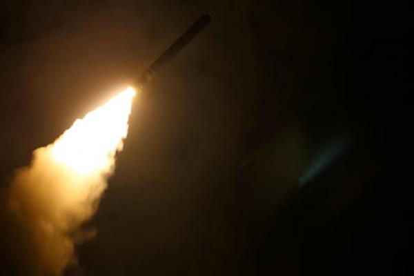 Kapal perusak berpeluru kendali Angkatan Laut AS USS Laboon menembakkan rudal serang darat Tomahawk pada 14 April 2018. Handout via REUTERS