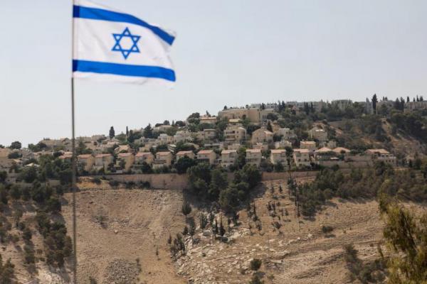Bendera Israel berkibar, sementara sebagian permukiman Israel di Maale Adumim terlihat di latar belakang, di Tepi Barat yang diduduki Israel, 14 Agustus 2025. REUTERS