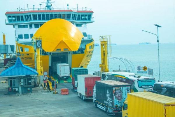 Sejumlah angkutan barang memasuki kapal penyeberangan di Pelabuhan Merak, Banten. Foto: asdp/jurnas