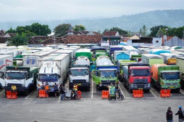 Komposisi kendaraan didominasi truk logistik, disertai bus dan kendaraan pribadi yang terus bergerak menuju area pelabuhan.
