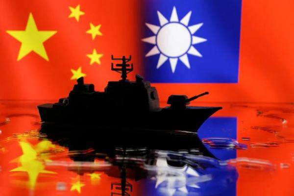 Sebuah miniatur Angkatan Laut terlihat di depan bendera China dan Taiwan yang dipajang dalam ilustrasi yang dibuat pada 11 April 2023. REUTERS