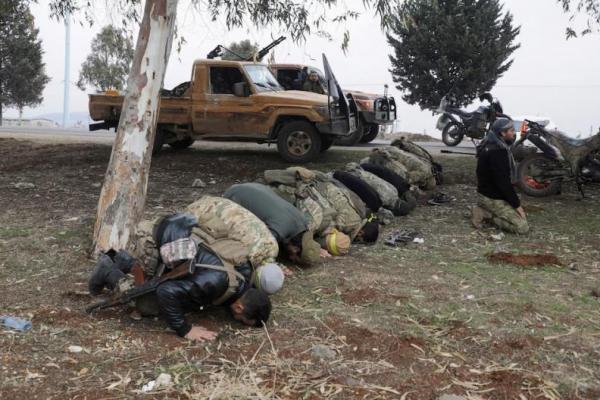 Pejuang pemberontak sholat di pedesaan Homs, setelah melancarkan serangan kilat di Suriah, 7 Desember 2024. REUTERS